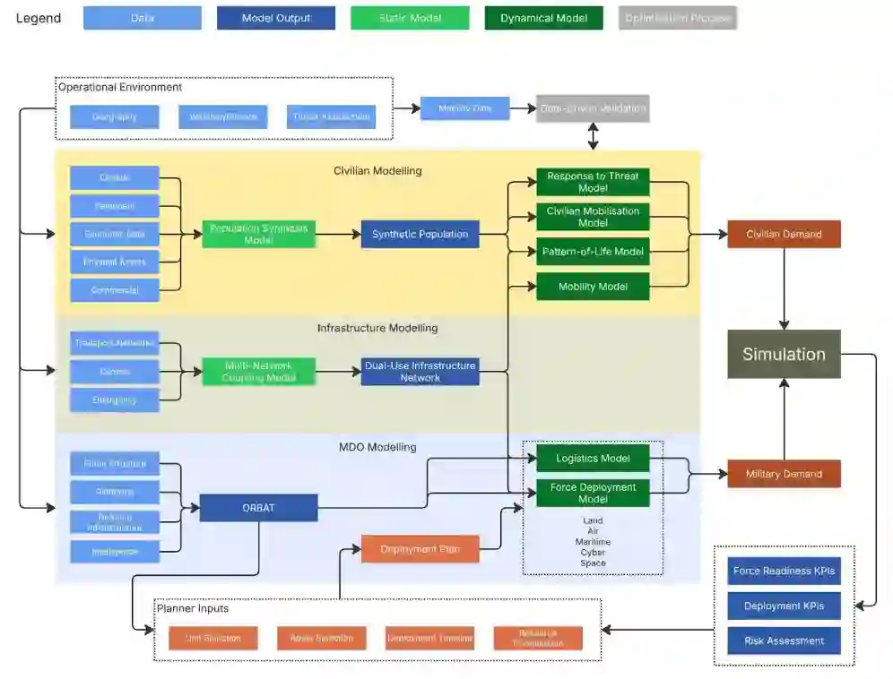 图1:多域作战建模的概念架构。将民用、基础设施和军事子系统集成到一个统一的仿真中,以捕捉军民对共享资源的动态竞争,并支持部署与战备分析。