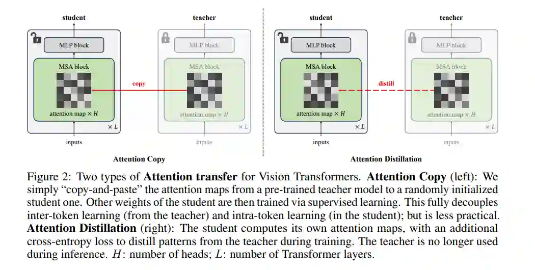 我们通过提出一种简单的方法——注意力迁移(attention transfer),验证了这一点。在这种方法中,仅从预训练的教师ViT中将注意力模式迁移到学生模型,迁移方式可以是直接复制或蒸馏注意力图。由于注意力迁移允许学生模型自行学习特征,将其与经过微调的教师模型进行集成还能进一步提高ImageNet上的准确率。