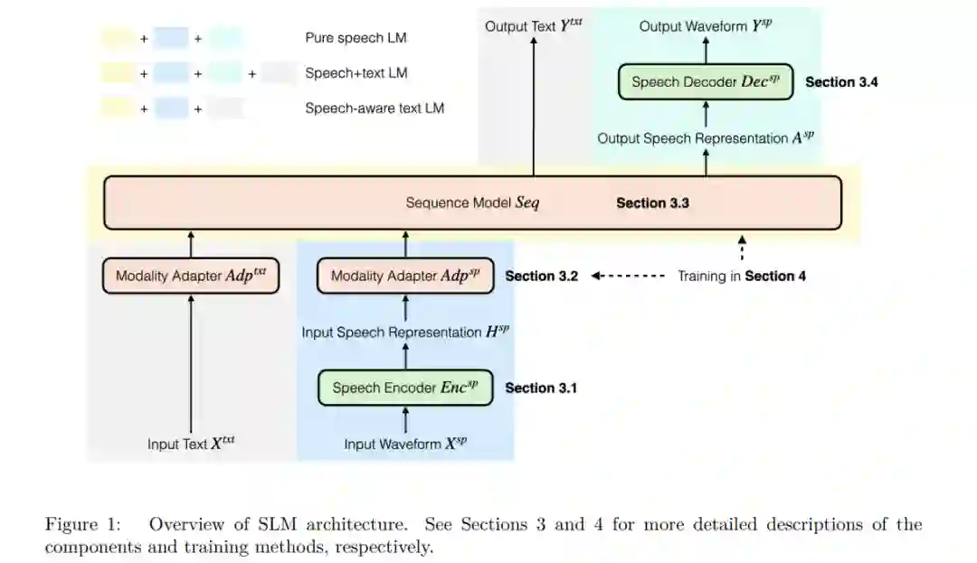 类比文本 LLMs,第(1)类与第(2)类模型可视为预训练 LLM 的语音版本。这些模型也可通过提示、偏好或其他方式进行后训练(post-training),以学习所需输出语音(第1类)或语音+文本(第2类)分布。在第(3)类中,模型通常基于已微调的文本 LLM 进行进一步后训练,使其对齐语音与文本表示,并执行新的语音任务。 尽管这些模型使用了不同的先验与建模方法,所有上述三类 SLM 都可视为迈向通用语音处理系统的重要步骤。本文将通用语音处理系统定义为满足以下条件的模型: 1. 具备语音输入与语音输出,文本输入与/或输出为可选项。语音输入可作为指令或上下文; 1. 模型具有“通用性”,即原则上应能够处理任意口语任务,包括传统任务与更复杂的语音数据推理任务; 1. 模型接收自然语言形式的指令或提示(语音或文本均可),而不仅限于任务标识符(Radford et al., 2023)或软提示(Chang et al., 2024)。