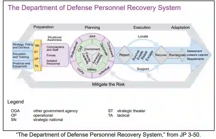 联合出版物 3-50 将人员救援定义为"为准备和执行失联人员的救援与再整合而进行的军事、外交和民事努力的总和"。预防隔离事件、为其制定计划并协调应对措施的人员救援职责涉及美国政府部门和机构。