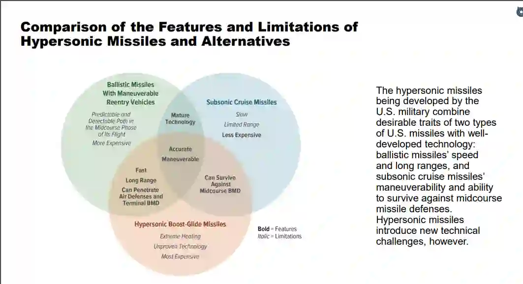 美国防部已经制定了一项战略,在冲突早期使用精确的高速导弹,以化解潜在对手,如俄罗斯正在开发的反介入和区域拒止(A2/AD)能力。高超音速导弹和配备机动弹头的弹道导弹都可以提供速度、精度、射程和生存能力(到达目标而不被拦截的能力),这在CBO考虑的军事场景中是有用的。然而,许多任务并不要求快速打击。对于这些任务,存在成本较低的高超音速导弹和弹道导弹的替代选项,包括亚音速巡航导弹。高超音速武器主要用于应对防御力强且时间极其敏感的威胁。
