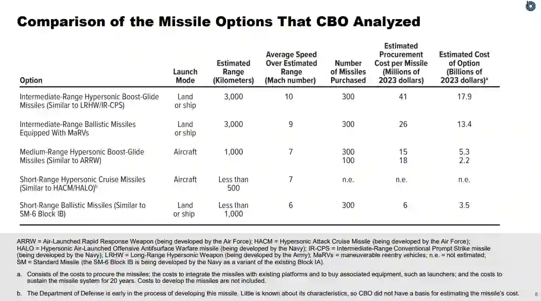 CBO估计,购买300枚带有机动弹头的地面或海上发射的中程弹道导弹,并将导弹系统维持20年,将总共花费134亿美元(按2023年美元计算)。CBO估计,同样数量的可比高超音速导弹的成本将增加约三分之一,即179亿美元。(这两项估计都不包括通常与技术上具有挑战性的项目有关的成本超支。) 高超音速导弹的较高成本部分反映了建立能够承受高超音速飞行热量的系统的复杂性。CBO的估计不包括导弹的研究和开发费用。