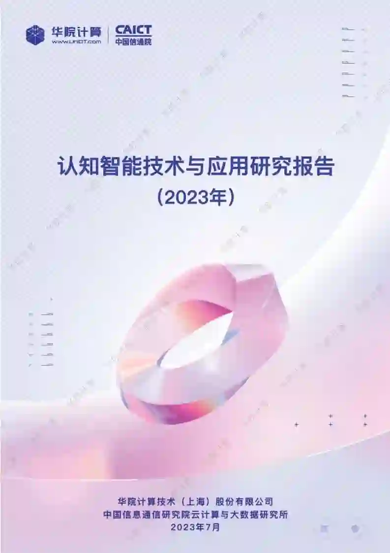 本报告由华院计算技术(上海)股份有限公司(以下简称“华院”)和中国信息通信研究院云计算与大数据研究所联合撰写,围绕认知智能发展现状、关键技术、典型应用场景和未来发展方向进行阐述,共分为四个部分。 第一部分聚焦认知智能发展现状,围绕学术环境、技术创新、产业规模等维度进行阐述; 第二部分聚焦认知智能关键技术,介绍知识数据融合、知识表示推理、认知规划与决策、多模态学习及情感计算五个技术方向;