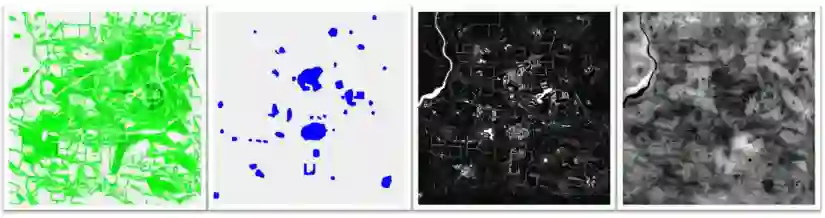 图4 这四幅图像描绘了影响我们成本地图计算的地形图层。从左至右,这些地图分别包含地形植被、城区、障碍物和视域信息。由于这些数据已针对整个仿真环境预先计算完成,将其用于工作量计算。称这些为“预计算地形信息”。