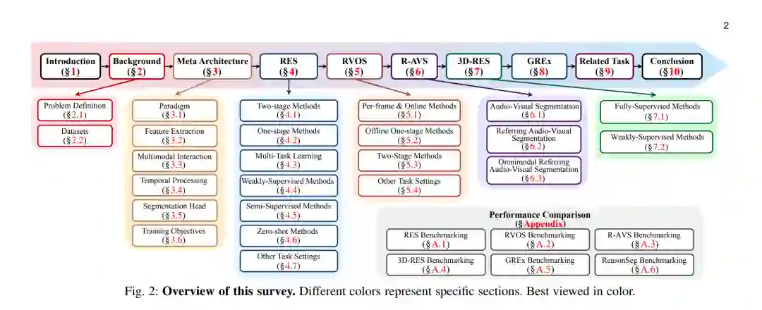 综述范围:本文聚焦于图像、视频(包括显著性视频与视听视频)和三维场景三大类视觉场景中的指代分割研究,以及文本、音频与全模态(omnimodal)三种主要指代模态,如图 4 所示。我们主要回顾基于深度学习的方法,重点介绍发表于顶级会议和期刊的代表性研究成果,并纳入具有前瞻性的近期预印本,以反映新兴趋势与未来方向。 * 文章结构:如图 2 所示,本文结构如下:第 2 节介绍任务定义与常用数据集;第 3 节提出统一的指代分割元架构;在该架构下,第 4 至第 7 节系统回顾图像、视频与三维场景中的代表性方法。第 8 节讨论面向真实复杂场景的广义指代表达(GREx)方法;第 9 节探讨相关任务与应用;第 10 节为总结与未来讨论。附录中还提供了基准性能对比结果。
