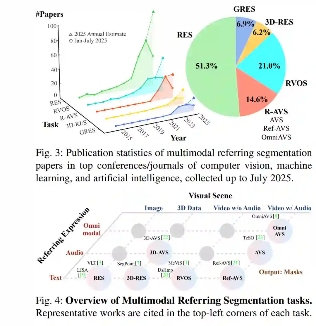 尽管不同指代分割任务之间具有一定的共性,但现有综述文献 [24]–[28] 大多局限于特定模态或任务类型。例如,近期一篇综述 [29] 仅关注二维图像上的指代表达分割,忽略了对视频和三维场景的扩展。因此,当前文献仍存在关键空白,缺乏系统覆盖多样任务形式、输入模态与挑战的综合性综述。填补这一空白对于加深该领域理解、推动通用化和多模态方法的发展至关重要。 为此,我们对多模态指代分割领域中 600 多篇论文进行了全面回顾。本文旨在统一不同视觉场景下的多样指代模态,为该领域提供连贯、结构化的理解,以提升其可接近性并促进跨任务洞察。此外,我们也强调了指代表达技术在实际应用中的潜力,特别是在具身智能(Embodied AI)等新兴领域中的变革性作用。
