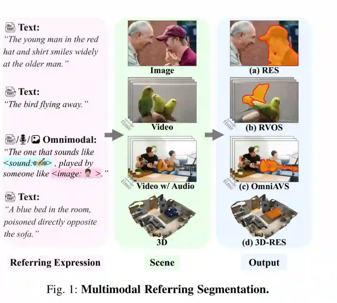 摘要——多模态指代分割旨在根据文本或语音格式的指代表达,在图像、视频和三维场景等视觉场景中分割目标物体。这一任务在需要根据用户指令进行精准目标感知的实际应用中发挥着关键作用。过去十年间,得益于卷积神经网络、Transformer 以及大语言模型的快速发展,该任务在多模态领域受到广泛关注,极大推动了多模态感知能力的提升。本文对多模态指代分割进行了全面综述。我们首先介绍该领域的背景,包括问题定义和常用数据集。随后,总结了一种统一的指代分割元架构,并系统回顾了在图像、视频和三维场景三类主要视觉场景中的代表性方法。我们还进一步探讨了解决真实世界复杂性挑战的广义指代表达(GREx)方法,以及相关任务与实际应用。此外,文中还在标准基准上提供了广泛的性能对比。我们持续维护相关工作的追踪链接:https://github.com/henghuiding/Awesome-Multimodal-Referring-Segmentation。 关键词——综述,多模态指代分割,指代表达分割,指代视频目标分割,指代视听分割,三维指代表达分割,多模态学习,视觉-语言