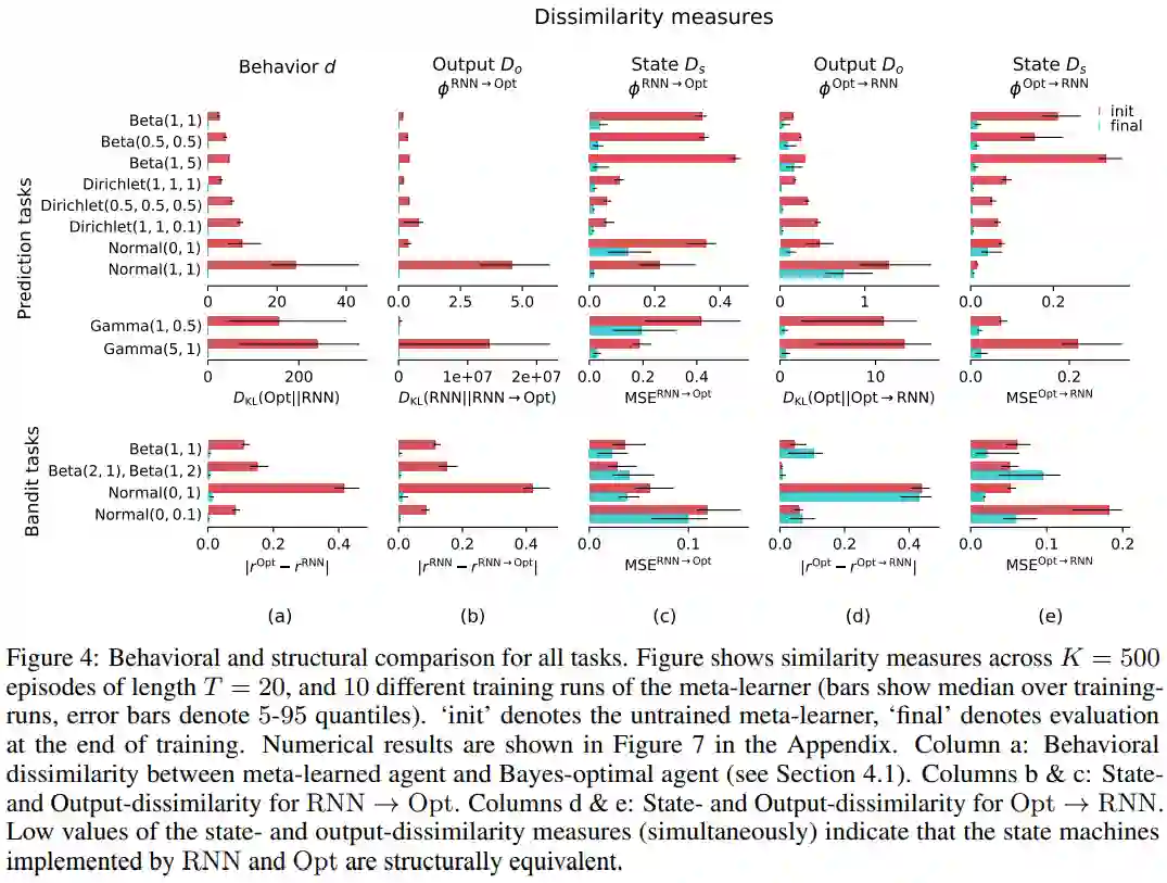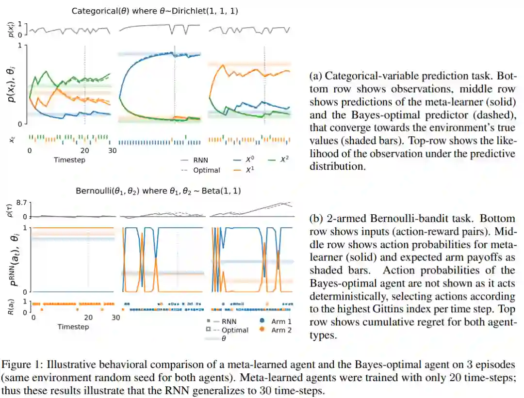 元学习代理的行为类似贝叶斯最优agent(第4.1节)。也就是说,元学习agent做出的预测和行动实际上与贝叶斯最优agent无法区分。