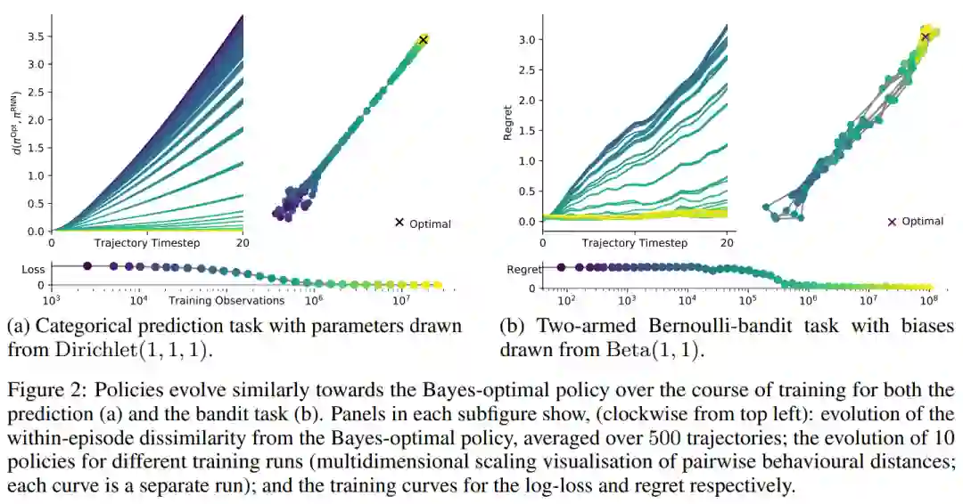 在元训练过程中,元学习者收敛于贝叶斯最优(第4.2节)。我们的经验表明,贝叶斯最优策略是学习动态的不动点。