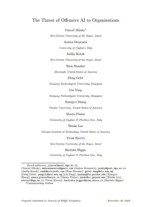 人工智能为我们提供了自动化任务的能力,从海量数据中提取信息,并合成几乎与真实事物无异的媒体。然而,积极的工具也可以被用于消极的目的。特别是,网络对手可以利用人工智能来加强他们的攻击和扩大他们的活动。虽然攻击性人工智能在过去已经被讨论过,但有必要在组织的背景下分析和理解这种威胁。例如,一个具有人工智能能力的对手是如何影响网络杀伤链的?人工智能是否比防御者更有利于攻击者?今天组织面临的最重要的人工智能威胁是什么,它们对未来的影响是什么?在这项研究中,我们探讨了攻击性人工智能对组织的威胁。首先,我们介绍了背景,并讨论了人工智能如何改变对手的方法、策略、目标和整体攻击模式。然后,通过文献回顾,我们确定了32种攻击性人工智能能力,对手可以利用这些能力来加强他们的攻击。最后,通过横跨工业界、政府和学术界的小组调查,我们对人工智能威胁进行了排名,并提供了对攻击者的洞察力。