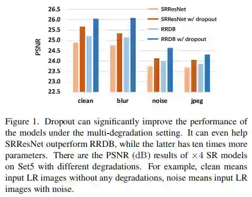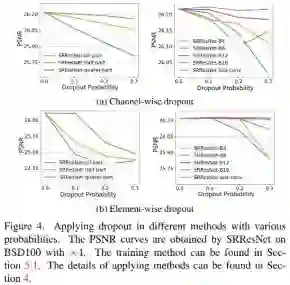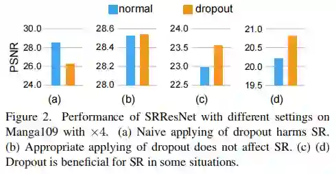 在分类、跟踪、检测等高等级计算机视觉任务中,Dropout操作被广泛用于降低模型在训练集上过拟合的风险,但这一操作在图像超分辨等底层视觉任务中仍未得到充分的探索。作为一种经典的回归问题,图像超分辨任务不仅值域连续,其性能也与Dropout的利用息息相关。本文的核心思想是Dropout同样可以适用于底层计算机视觉任务,只是对于dropout的加入方式需要进行细微的调整,合理的应用dropout能够带来网络性能的提升。因此,本文作者进行了细致的实验与分析,证实合理使用dropout有益于超分模型性能提升,并改善其泛化性能 。