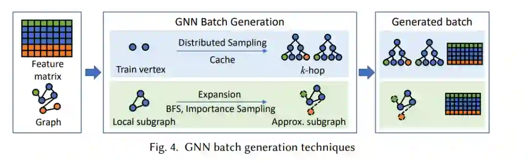 小批GNN训练是将GNN扩展为大型图的常用方法。图采样实际上是在独立模式下生成小批量的工具。到目前为止,已经提出了许多基于采样的图神经网络[17,23,46,56,125,151],根据采样方法的不同类型,可以分为顶点采样、层采样和子图采样。不同的批生成方法会影响训练效率和训练精度。为了避免图采样成为瓶颈,人们对高效GNN数据加载器进行了一些探索[5,25,27,76]。在小批分布式GNN训练中,数据依赖性为批生成过程带来了大量的通信。为了提高分布式环境下的训练效率,针对分布式训练提出了几种新的GNN批生成技术,并解决了挑战#1和挑战#2。如图4所示,一种解决方案是通过分布式抽样生成小批处理,另一种是直接使用本地分区(或子图)作为小批处理。