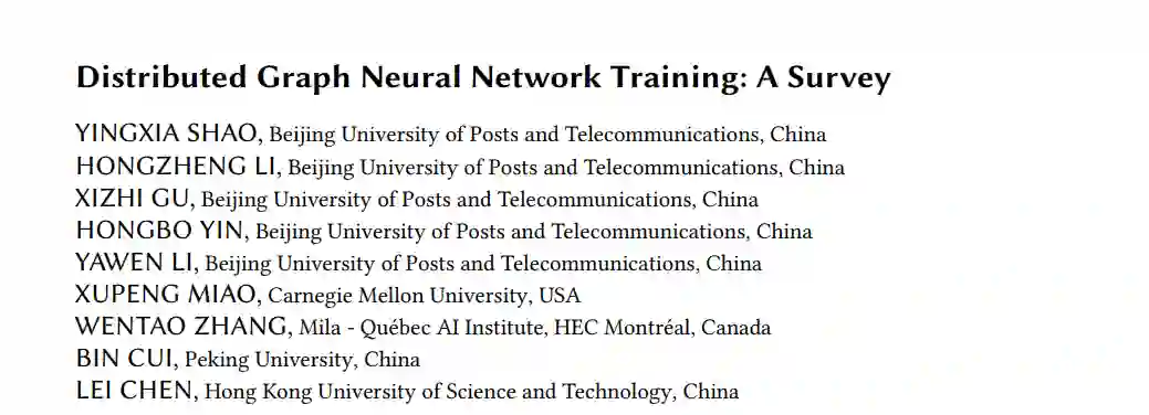 如今,大规模图神经网络[62,70]由于大规模大图数据的普遍存在而成为一个热门话题。拥有数十亿个顶点和数万亿条边的图形是很常见的,比如新浪微博、微信、Twitter和Facebook等社交网络。然而,现有的大多数GNN模型只在小图数据集上进行测试,无法处理大图数据集[50]或效率低下。这是因为之前的GNN模型比较复杂,在处理大型图时需要大量的计算资源。通过设计可扩展的GNN模型,实现了大规模的图神经网络。他们使用简化[36,47,110],量化[4,33,54,71,90,100,101,107,139],取样[20,123,125]和蒸馏[24,121,131]来设计高效的模型。另一种方法是将分布式计算应用于GNN训练。因为在处理大型图形时,单个设备(如GPU)有限的内存和计算资源成为大规模GNN训练的瓶颈,而分布式计算提供更多的计算资源(如多GPU、CPU集群等)来提高训练效率。在设计高效的分布式GNN训练框架(如PipeGCN [99], BNS-GCN[98])和分布式GNN训练系统(如AliGraph [150], DistDGL [142], ROC[58])方面已经做出了许多努力。在这个调查中,我们关注的工作与分布式计算的大图神经网络,又称分布式GNN训练。它将整个模型训练的工作量分配给一组工人,所有工人并行处理工作量。然而,由于GNN的数据依赖性,将现有的分布式机器学习方法[96,103]应用于GNN并非易事,许多新的技术被提出来优化分布式GNN的训练管道。尽管有很多关于GNN模型的调查[114,135,147],但据我们所知,很少有人系统地回顾分布式GNN训练的技术。最近,Besta等[9]只回顾了GNN的并行计算范式,Abadal[1]从算法到硬件加速器考察了GNN计算。