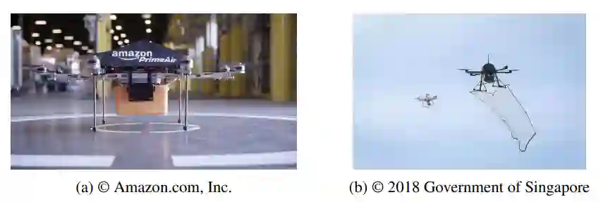 图1.1:(a)"极速航空"是亚马逊开发的未来物流系统,通过无人机(UAV)在30分钟内将包裹安全送达客户;(b)无人机拦截器追踪侵入管制空域的无人机,使用抓捕网实施捕获。基于多无人机协同的反无人机技术,是构建未来智能空基平台的解决方案之一。