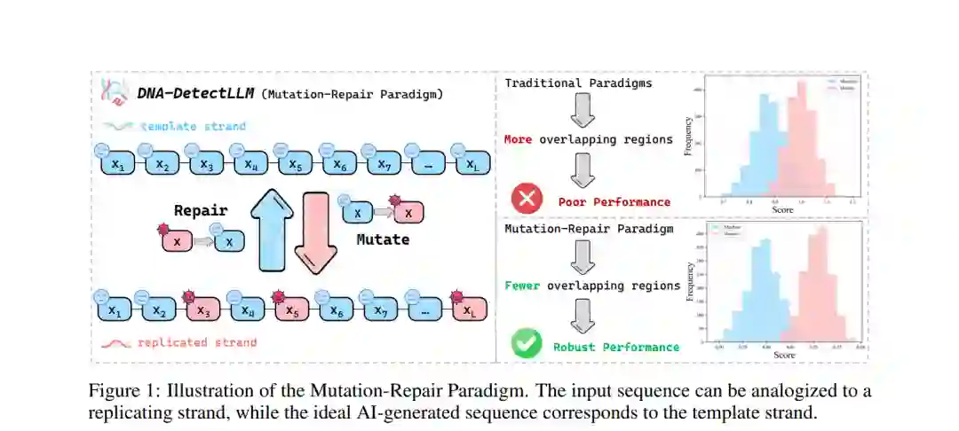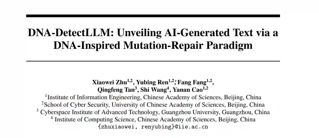 大型语言模型(LLMs)的快速发展模糊了 AI 生成文本与人类撰写文本之间的界限。这一进展带来了社会风险,例如虚假信息、作者身份模糊以及知识产权争议,凸显了开发可靠的 AI 生成文本检测方法的迫切需求。然而,随着生成式语言建模的最新进展,人类撰写文本与 AI 生成文本的特征分布出现显著重叠,从而模糊了分类边界,使得准确检测愈发具有挑战性。为应对上述挑战,我们提出了一种 DNA 启发式视角,通过基于修复的过程直接且可解释地捕捉人类撰写文本与 AI 生成文本的内在差异。在此基础上,我们引入 DNA-DetectLLM,一种零样本检测方法,用于区分 AI 生成与人类撰写的文本。该方法针对每个输入构造一个理想的 AI 生成序列,迭代性地修复非最优 token,并将累计修复开销量化为可解释的检测信号。实验结果表明,该方法在检测性能上达到了最新的水平,并在面对多种对抗攻击与不同输入长度时表现出强鲁棒性。具体而言,DNA-DetectLLM 在多个公共基准数据集上的 AUROC 提升了 5.55%,F1 分数提升了 2.08%。