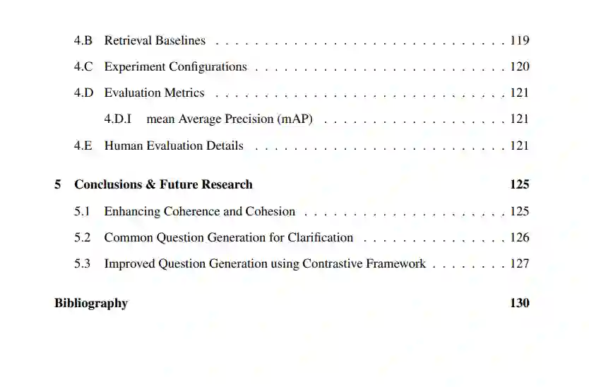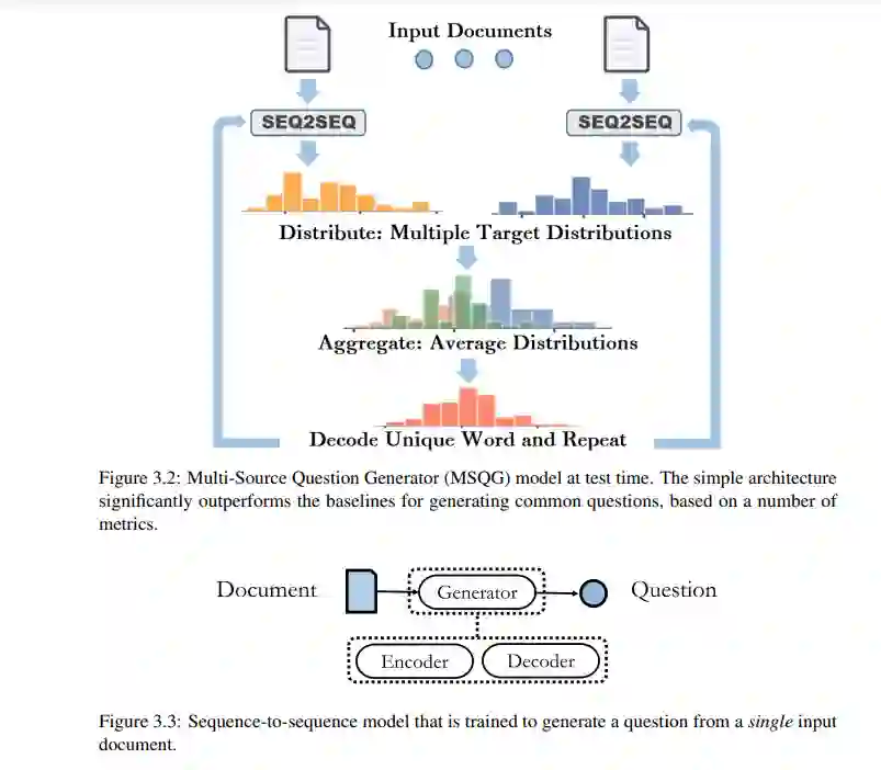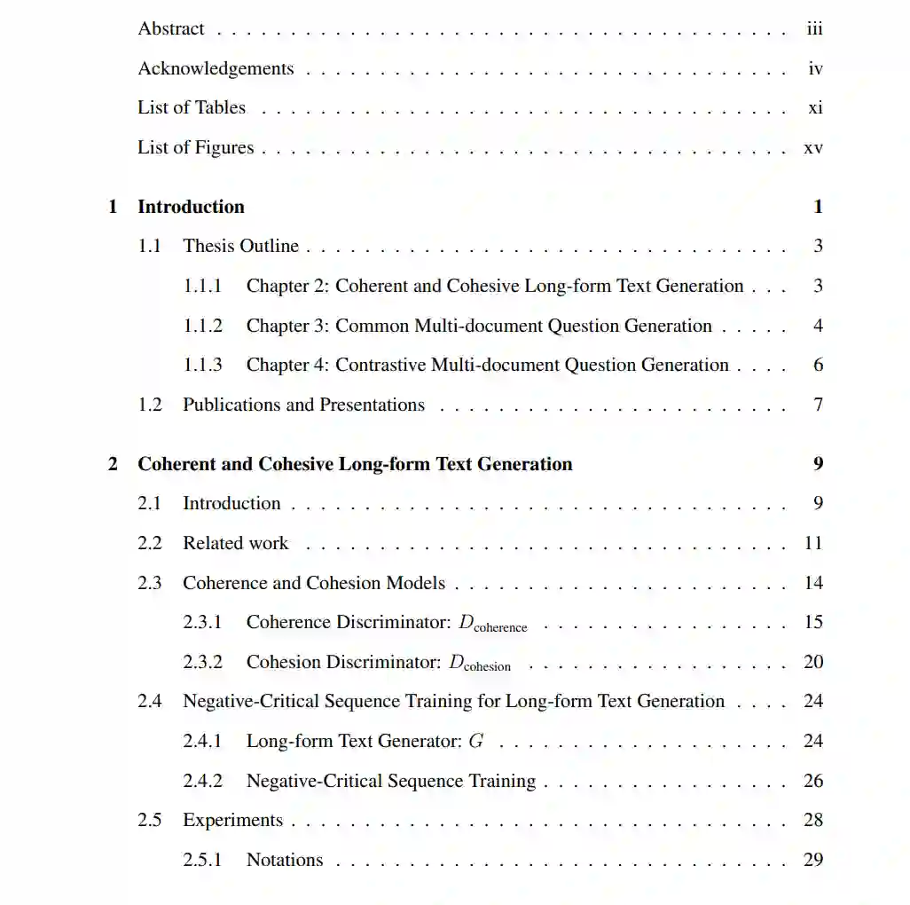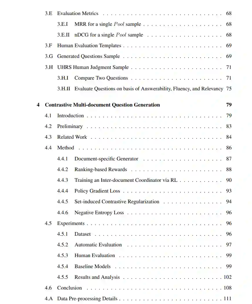在本论文中,我们提出了两个神经鉴别器,为神经语言模型提供连贯性和衔接性的奖励信号。接下来,我们从以下观察的动机出发,解决了另一个有趣的挑战:搜索引擎中的模棱两可的用户查询往往会检索到涉及多个主题的文档。一个潜在的解决方案是让搜索引擎为最初输入模棱两可查询的用户生成多个经过精炼或澄清的查询,以便每个经过精炼的查询与涉及相同主题的文档子集相关联。实现这一目标的初步步骤是生成一个捕捉多个文档的共同概念的问题。为此,我们提出了一个新的任务,即从多个文档中生成一个共同问题,并呈现了一个现有多源编码器-解码器框架(多源问题生成器,MSQG)的简单变种。然而,这个简单的模型类仅使用目标(“正面”)多文档集,并且可能会生成涵盖比文档集所划定范围更大范围的通用问题。为了解决这个挑战,我们引入了对比学习策略,在给定“正面”和“负面”文档集的情况下,生成一个与“正面”集密切相关但与“负面”集相距较远的问题。我们还提出了一种有效的辅助目标,即基于集合的对比正则化(SCR),用于开发多源协同问题生成器(MSCQG)。