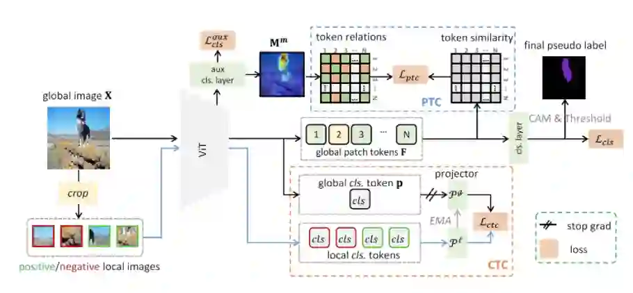 在本文中,所提出的方法名为Token Contrast(ToCo),该方法用于提高使用图像级标签的弱监督语义分割(WSSS)的性能。ToCo 解决了 Vision Transformer (ViT) 的over-smoothing问题,并进一步探索了它在 WSSS 中的潜力。引入了两个模块:Patch Token Contrast (PTC) 和Class Token Contras (CTC),以提高 CAM 的准确性。Patch Token Contrast (PTC) 模块使用来自中间层的伪代币关系来监督最终的补丁令牌,从而使它们能够对齐语义区域,从而产生更准确的 CAM。Class Token Contrast (CTC) 模块通过对比不确定的局部区域和全局对象的类标记来促进其表示一致性。CTC 利用 ViT 中类代币捕获的高级语义,帮助区分 CAM 中的低可信度区域。这些实验是在PASCAL VOC和MS COCO数据集上进行的,以证明所提出的方法的有效性。