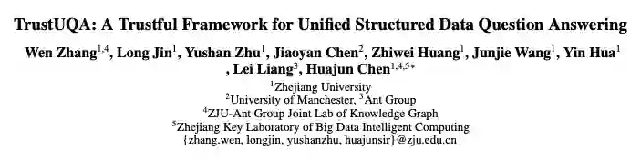 **论文题目:**TrustUQA: A Trustful Framework for Unified Structured Data Question Answering **本文作者:**张文(浙江大学)、金龙(浙江大学)、朱渝珊(浙江大学)、陈矫彦(曼彻斯特大学)、黄志伟(浙江大学)、汪俊杰(浙江大学)、华尹(浙江大学)、梁磊(蚂蚁集团)、陈华钧(浙江大学) **发表会议:**AAAI 2025 **论文链接:**https://arxiv.org/abs/2406.18916 ****代码链接:https://github.com/zjukg/TrustUQA 欢迎转载,转载请注明出处