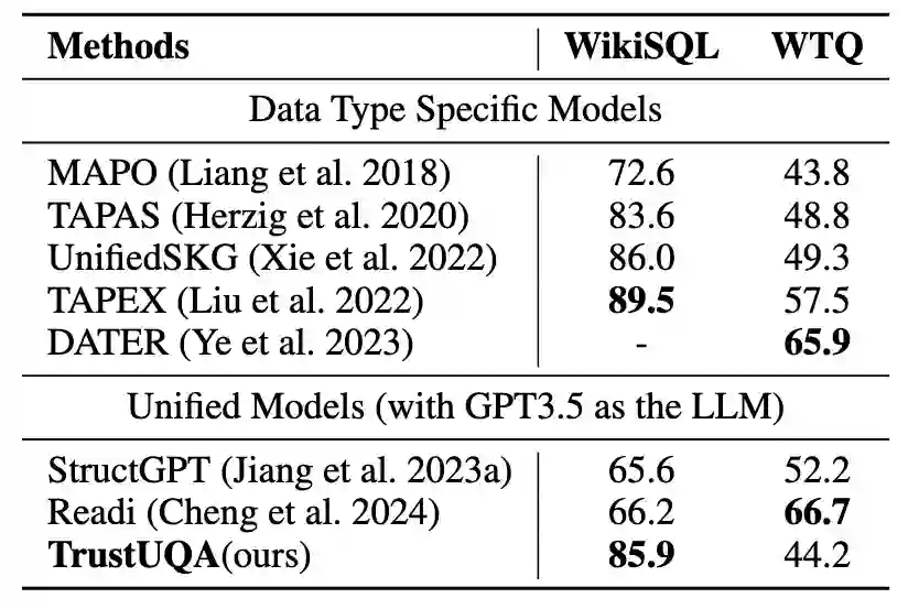 在本文中,我们提出了名为TrustUQA的统一的结构化数据问答的可信框架,其基于一种全新的、通用的数据表示方法——条件图及两阶段查询函数。通过实验证明了TrustUQA在不同类型的结构化数据上的有效性,并展示了处理更一般和更具挑战性的场景的潜力。在未来,我们将探索混合结构化数据问答和跨结构化数据问答等更具挑战性的场景,使得更接近实际应用。