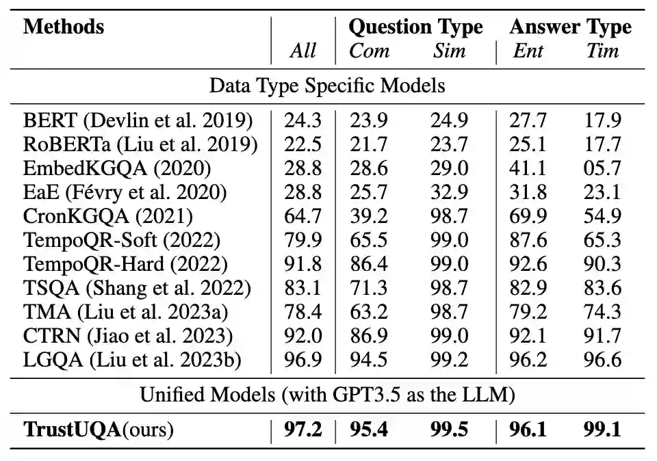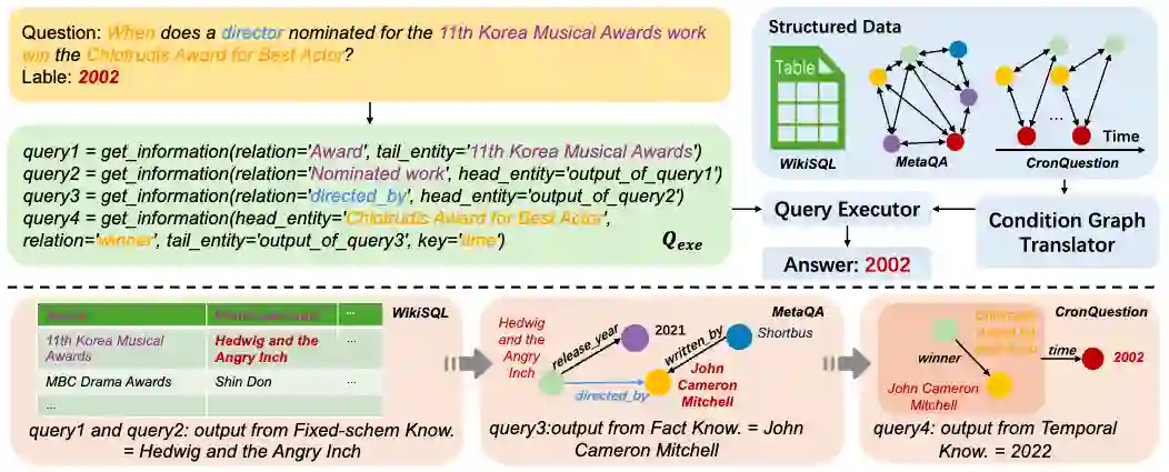 图6 跨结构化数据问答分析在文章最后,我们还探索了TrustUQA在混合结构化数据上的QA和跨结构化数据的QA方面的潜力。如图6所示,解答图中的问题依次需要用到表格、知识图谱、时序知识图谱中的数据,通过TrustUQA可以实现跨结构化数据的问答,证明TrustUQA跨结构化数据的问答的潜力。