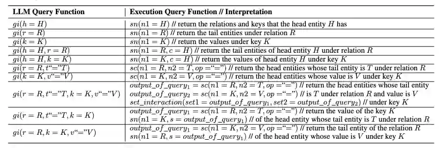 通过两阶段查询函数实现结构化知识推理与问答。首先通过LLM生成一阶段查询函数,后通过预定义的规则将一阶段查询函数转化为二阶段可执行函数,得到问题答案。在一阶段查询函数,我们设计如下搜索函数从条件图中搜索信息:除上述搜索函数之外,我们还设计了集合操作函数及数值计算函数。在二阶段查询函数,搜索函数将转化为以下可执行函数: