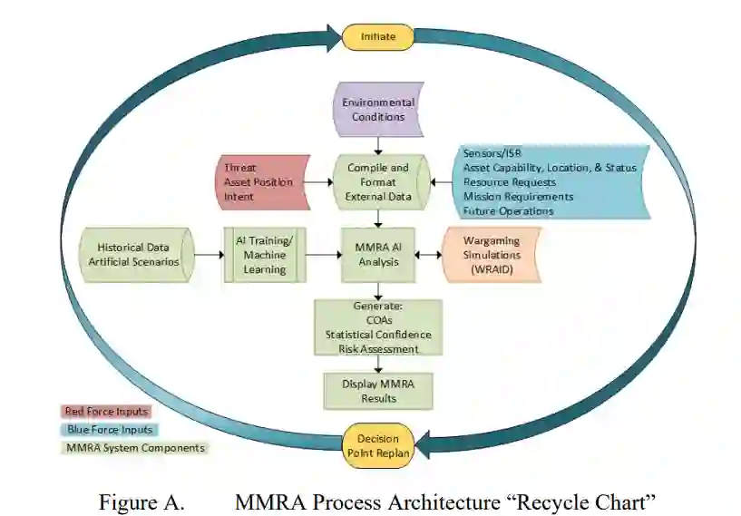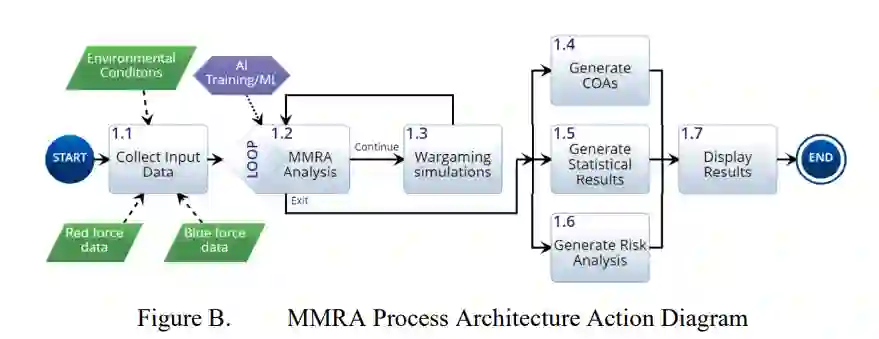 如图A所示,MMRA被设想为在确定的决策点由人在回路中激活。在这些事件中,MMRA系统用实时输入进行一次循环。由黑盒MMRA系统确定的输出被显示给人在回路中的人,以进行标准决策程序。虽然这项研究仅限于问题的分解,但未来的研究领域是开发一个由人类系统集成(HSI)驱动的产品实现。MMRA通过对日益复杂和相互依赖的资源分配问题进行客观评估,加强了指挥系统的决策。图B描述了MMRA人工智能系统过程的行动图。