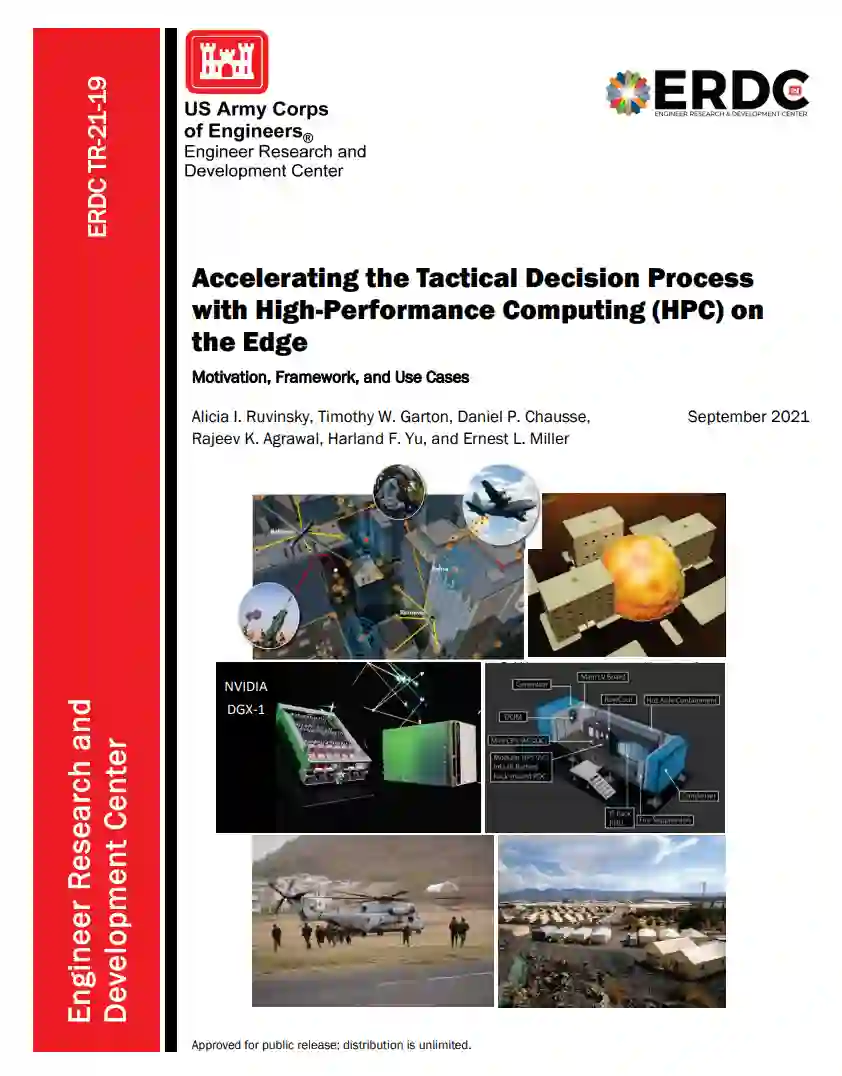 本报告概述了一个人工智能(AI)系统的设计,用于在战术作战环境中的近实时分析,在同地的移动HPC硬件上执行。该报告包括以下几个部分:(1)描述动机、背景和技术状况的介绍;(2)利用HPC问题定义和用例的战术决策过程描述;(3)HPC战术数据分析框架设计,使数据变成决策。