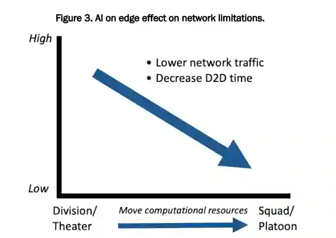 人工智能边缘计算将通过把计算带到数据上而不是把数据移到这些强大的计算机资源上来减少网络流量需求。这将减少从数据到决策所需的时间(图2)。边缘计算在将计算资源移至数据源附近时,利用了更小、更强大的设备,从而减少了网络流量,使计算资源更接近前线(图3)。它将分析数据所需的计算汇集到数据源;数据到决策(D2D)的时间减少了,从数据中提取的见解和信息被高度压缩并更容易分享,更多的计算能力可以在更小的设备中得到。传统的方法是在低层(战术边缘)收集数据,并将数据传输到高层进行处理和分析。这种方法的结果是随着数据源的不断增加而出现了扩展问题。它通过传输未处理的数据给网络带来了负担。数据传输成为一个主要的瓶颈,影响了战场的节奏。