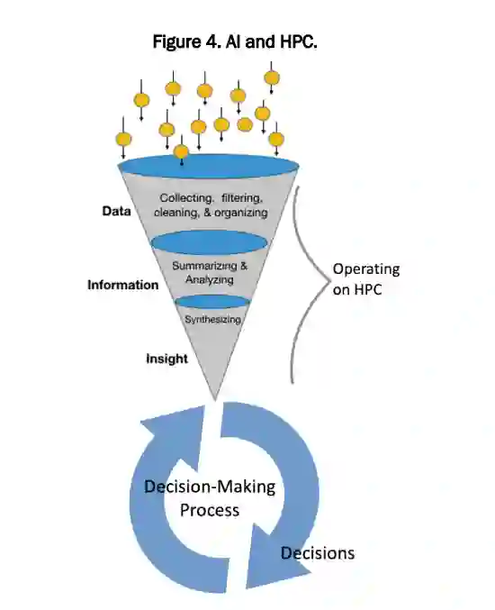 这项工作的目的是研究人工智能和HPC一起工作,以推进关键的军事能力,如态势感知(图4)。边缘的HPC加人工智能提供了对本地数据的近乎实时的利用,支持高度的自主性,计算资产被移到离数据源更近的地方,增加了数据分析的深度和广度,减少了做决定的时间,洞察力为决策提供了依据。