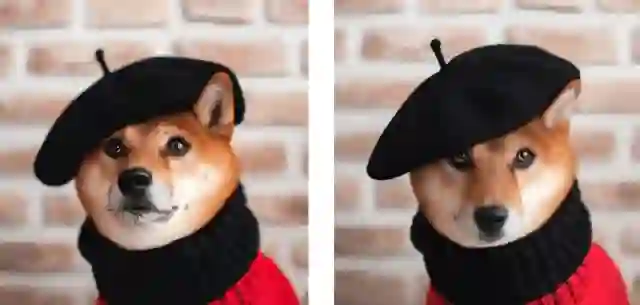 狗戴着贝雷帽、穿着黑色高领毛衣