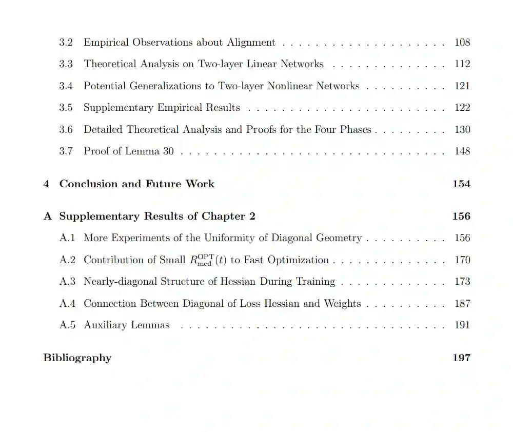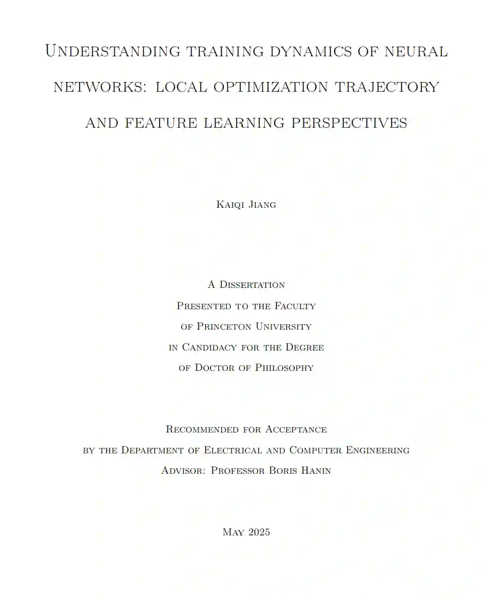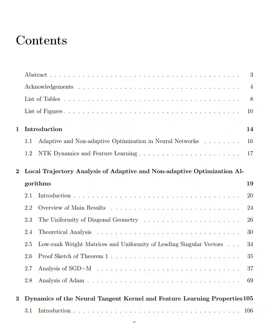 本论文将聚焦于神经网络中优化算法的局部轨迹,并尝试从优化视角和特征学习视角理解其训练动态。 从优化视角出发,我们将比较自适应优化方法(如 Adam)与非自适应方法的局部损失几何,并指出自适应方法可能会将其轨迹偏向具有某种均匀性特性的区域。接着,我们将证明这种均匀性特性是促使优化加速的一个重要因素。