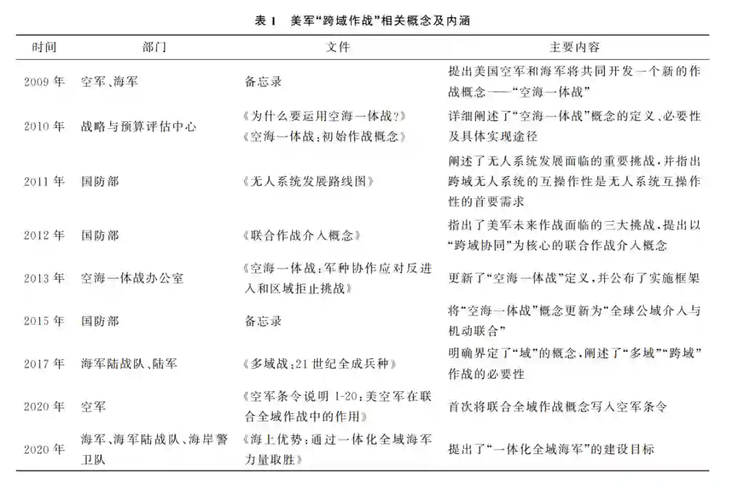 海战场是军事对抗的重要战场之一,海上作战涉及空中、水面、水下以及海岸陆地等空间,作战资源对象 数量庞大且能力多样。随着无人系统技术的不断发展,跨域无人集群将成为未来海上作战的重要力量。以海 上跨域无人集群作为研究对象,首先梳理了跨域作战的相关概念及演变过程,定义了跨域无人集群的内涵,然 后阐述了美军单域无人集群项目的发展趋势及现状,分析了近期跨域无人集群演习的主要内容,之后对无人集 群关键技术现有研究成果进行了提炼总结,指出了跨域无人集群发展面临的挑战。最后给出了跨域无人集群 未来的发展趋势。无人系统具有成本低、操作灵活、不惧伤亡等优 势,能够深入恶劣、危险的环境中执行任务[1-2],在现 代作战中具有广阔的应用前景。已有诸多学者对无 人 集 群 的 编 队 控 制[3-5]、构 型 演 化[6-7]、路 径 规 划[8-10]、任务分配[11-13]等问题开展了研究,取得了一 定的成果。 2022年10月29日,乌克兰采用无人机和无人 艇组成的无人集群对俄军黑海舰队进行突袭并取得 成功,受到了广泛关注。相较于单域无人集群,运用 多域无人系统组成跨域无人集群,能够通过跨域平 台间的任务协同、信息融合、资源互补实现平台优势 互补,进一步拓展无人集群作战运用场景,充分发挥 无人集群的体系作战优势。 从当前无人作战案例和各国无人系统发展趋势 上可以看出,跨域无人集群将成为无人作战系统发 展的一个重要方向。为促进相关技术的研究和发 展,本文从“跨域作战”概念的演变过程入手,对跨域 无人集群的发展概况、作战样式、关键技术研究现状 进行了梳理和分析,最后指出跨域无人集群的未来 发展趋势。