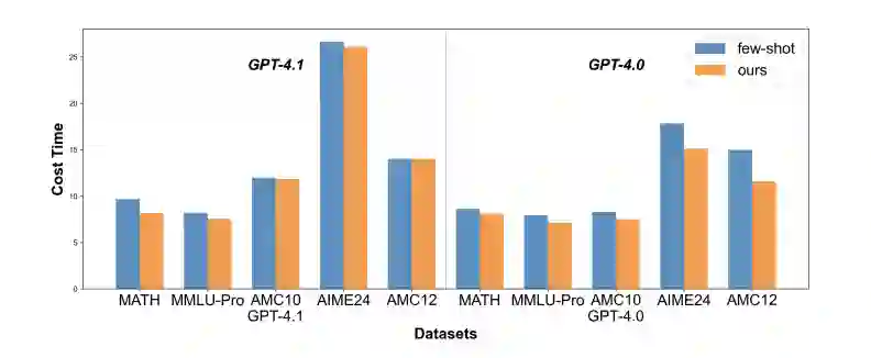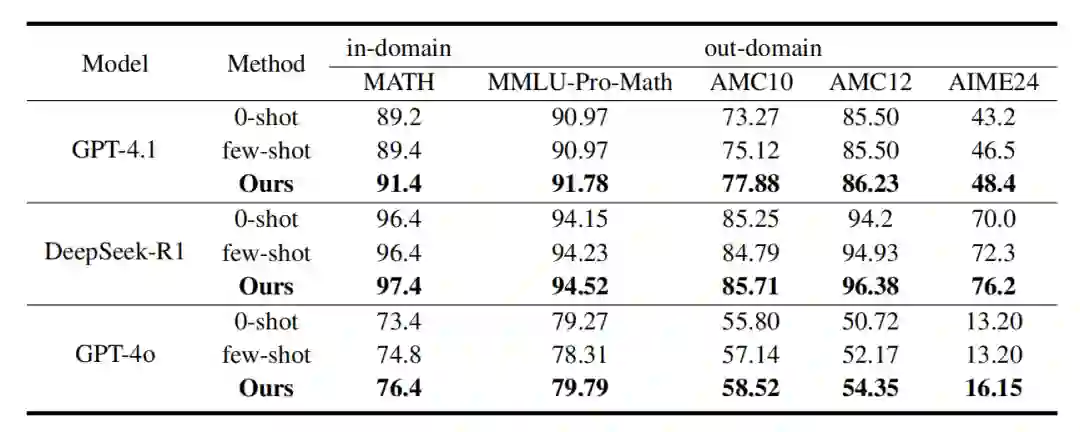 我们在五个数学推理数据集上评估方法: 领域内:MATH 领域外:MMLU-Pro-Math、AMC10、AMC12、AIME24 使用模型包括GPT-4.1、GPT-4o、DeepSeek-R1,对比基线为零样本与少样本链式思维方法。 主要结果