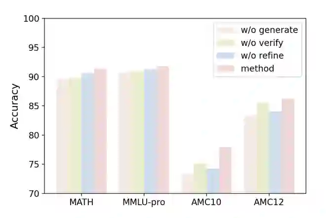 我们验证了框架中各个组件的必要性: 缺少高级生成:在领域外数据集上性能下降明显,说明数据多样性至关重要。 缺少质量验证:会导致噪声引入,降低检索知识的有用性。 缺少检索后精炼:直接使用检索到的原始模板和定理可能因不兼容而损害性能。 联合使用模板与定理:实验证明,同时提供模板(经验)和定理(知识)比单独提供任何一种效果更好,印证了人类解题时二者结合的必要性。