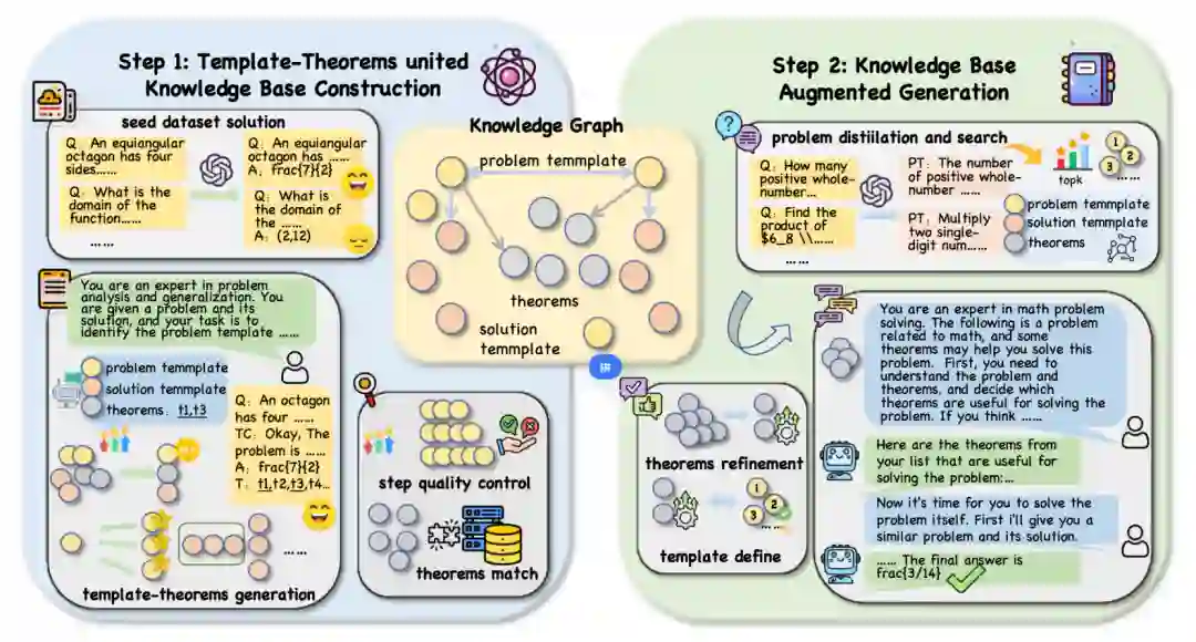 模板-定理图谱构建 传统检索方法通常基于问题文本的语义相似性,难以捕捉问题间的结构相似性。为此,我们提出将具体问题抽象为问题模板与解题模板,并与相关定理建立关联。 生成阶段 基础生成:从种子数据集中抽取问题与答案,利用LLM生成推理链,并提取过程中调用的定理,形成初步模板与定理对。 进阶生成:通过跨难度采样与模板改写两种方式,扩展模板多样性,避免模型偏见,形成层次化的模板结构。 验证阶段 为确保生成内容的质量,我们设计了多级验证机制: 答案验证:过滤答案错误的样本。 一致性验证:对比基于实际问题和模板问题生成的定理,保留一致性强的内容。 步骤质量控制:根据问题难度过滤步数异常样本。 定理匹配:与权威定理库进行比对,确保逻辑正确性。 图谱检索增强生成 在推理阶段,我们模拟人类的检索过程,从图谱中提取最相关的模板与定理作为上下文输入。 问题提炼:将输入问题抽象为模板形式,提升与图谱的匹配能力。 检索与精炼:基于模板检索Top-K相关条目,整合定理信息,重新选择最优模板,避免信息冲突。 上下文融合:将最终选定的定理表与模板输入下游模型,辅助推理。 三、实验