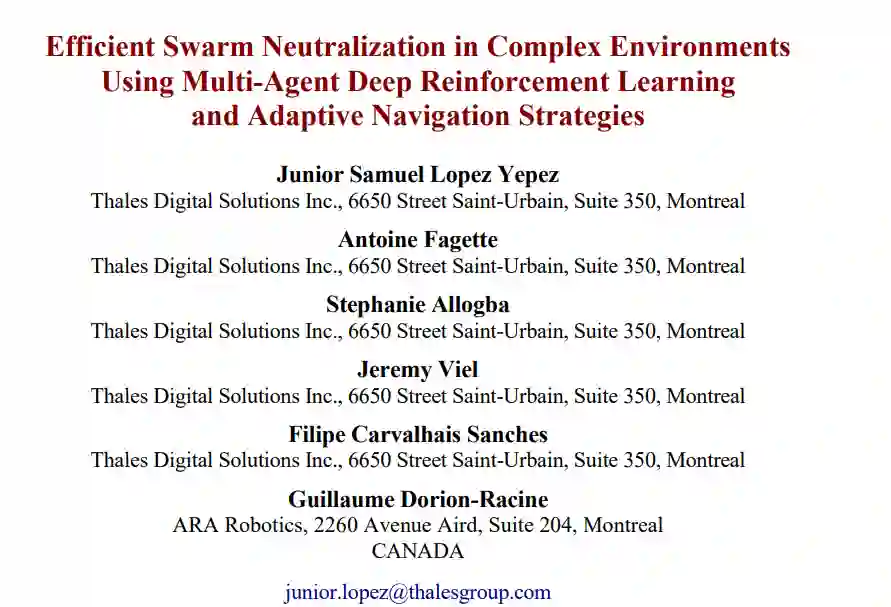 本研究项目提出了一种新颖的 "蜂群对蜂群"(swarm versus swarm)方法,利用相同或更多数量的协作式自主无人机,有效地抵御可能以蜂群形式进化的入侵无人机。蜂群中的每架无人机都与蜂群中的其他无人机协调,独立执行行动,每次任务最多可对抗五架敌方无人机。我们的方法利用顺序决策过程,将任务划分为不同的阶段--接近、跟踪和中和--以尽量减少蜂群互动过程中的冲突,并加强自主操作过程中的控制。此外,我们还划定了一个飞行保护区,严禁任何敌方无人机侵入,否则将视为任务失败。为了确保在复杂环境中的安全导航,我们建议将防御蜂群的飞行限制在一个被称为缓冲区的划定空域内,缓冲区包括保护区。缓冲区内的任何入侵都会触发我们系统的响应,进而使防御蜂群采取一系列协调行动,阻止敌方无人机进入保护区。我们采用多智能体深度强化学习框架,在模拟器上集中训练,分散执行,在简单的模拟环境中优化决策过程,然后在现实模拟器中进行测试,并部署真正的无人机进行实地操作。