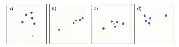 图 2:在二维模拟器上,针对五架防御无人机(蓝色)与一架目标无人机(红色)的使用案例,经过 MARL 训练的协作导航模型表现出不同的防御行为。在(a)中,无人机以凹形队形接近目标定位。在某些情况下会产生一个线性障碍( b)。捕捉目标的典型行为是包围目标,如 (c) 所示。至少有一架无人机作为蜂群的后援也是常见现象(d)。