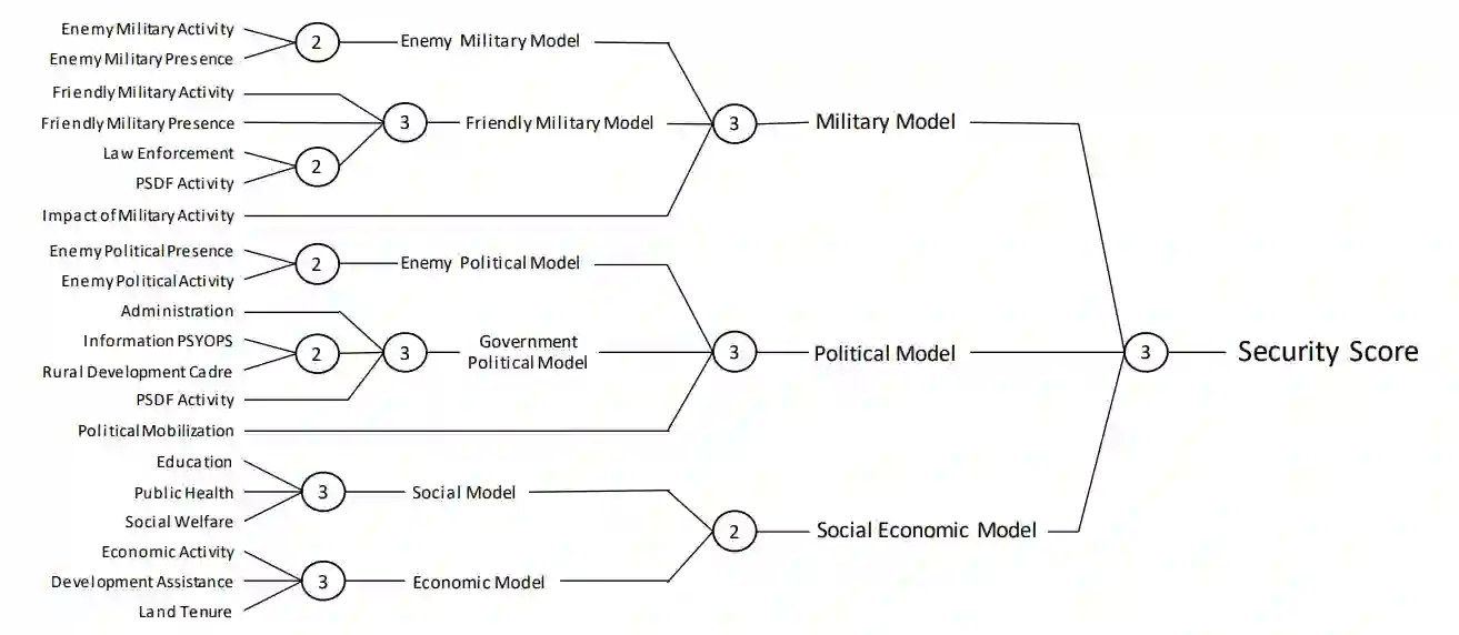 特别是,最初的 HES 是由各种 "子模型分数 "组成的,这些分数根据调查反馈来衡量每个地区的不同方面(如经济变量、地方行政管理、敌方军事存在)。然后,该系统通过使用预定义决策表确定如何合并不同分数的三级分层汇总方法,将这些分数合并为一个单一的安全分数。然后将安全分数提交给空军指挥官,由他们做出目标选择决策。因此,我们的目标是通过改变基本决策表来修改 HES,找到能优化各种发展目标的决策表,同时限制个别地区这些目标恶化的风险。