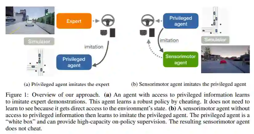 基于视觉的城市驾驶是困难的。自主系统需要学会感知世界并在其中行动。我们证明这个具有挑战性的学习问题可以通过把它分解成两个阶段来简化。我们首先训练一个可以访问特权信息的智能体。这个特权智能体通过观察环境的真实布局和所有交通参与者的位置来作弊。在第二阶段,有特权的智能体充当老师,训练一个纯粹基于视觉的感觉运动智能体。产生的感知运动智能体不能访问任何特权信息,也不会欺骗。这个两阶段的训练程序一开始是反直觉的,但是我们分析和实证证明了它有许多重要的优势。我们使用所提出的方法来训练一个基于视觉的自动驾驶系统,该系统在卡拉基准测试和最近的NoCrash基准测试上的表现远远超过现有水平。我们的方法首次实现了原始CARLA基准测试中所有任务的100%成功率,在NoCrash基准测试中创下了新记录,并将违规的频率与现有技术相比降低了一个数量级。