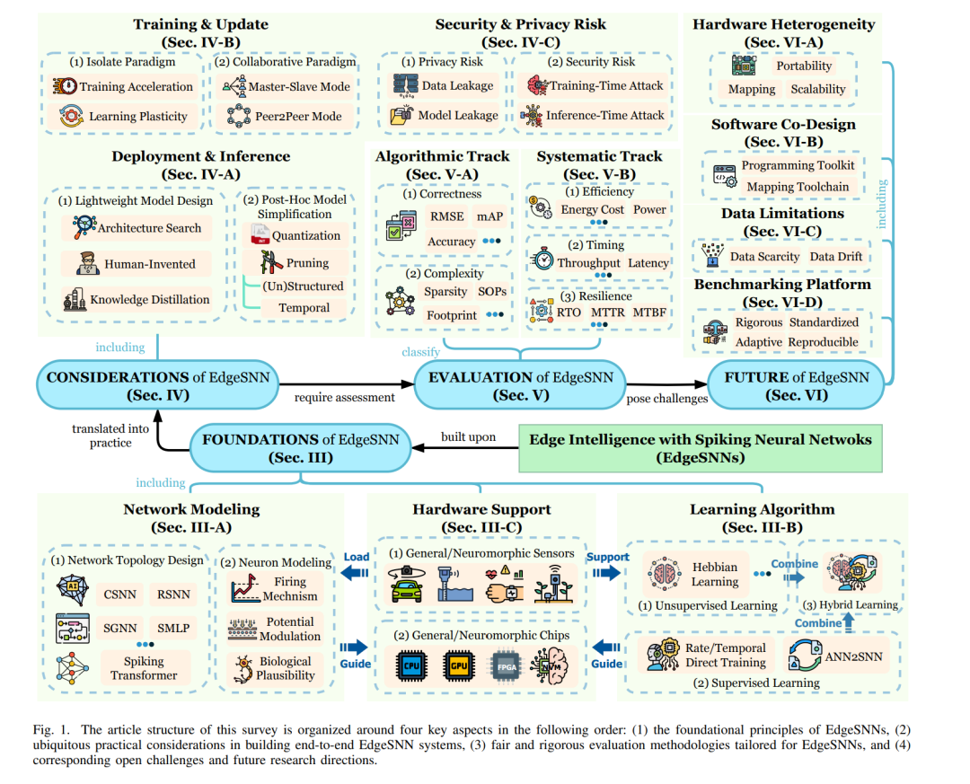 摘要——人工智能与边缘计算的融合正推动在资源受限设备上实现智能服务的研究热潮。传统深度学习模型通常依赖大量计算资源和集中式数据管理,进而带来延迟高、带宽占用大和隐私泄露等问题,暴露出以云为中心范式的关键局限。受大脑启发的计算范式,尤其是脉冲神经网络(Spiking Neural Networks, SNNs),通过模拟生物神经元的动态行为,实现了低功耗、事件驱动的计算,为边缘智能提供了一种有前景的替代方案。 本文对基于 SNN 的边缘智能(EdgeSNNs)进行了全面综述,重点探讨其在边缘场景下解决本地学习、推理与安全性等关键挑战的潜力。我们系统性地梳理了 EdgeSNN 的基础体系结构,包括神经元模型、学习算法和支持性硬件平台。围绕 EdgeSNN 的三个典型现实需求进行了深入探讨: 1. 利用轻量化 SNN 模型实现本地推理; 1. 在非平稳数据条件下进行资源感知的训练与更新; 1. 面向隐私与安全保护的机制设计。