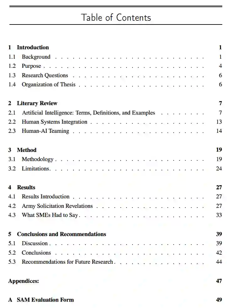 在2003年至2022年期间发布到SAM的机会中,只有16%(238个中的40个)在开发过程中足够成熟,可以考虑进行评估。在这40个被认为足够成熟的采购开发过程中,只有16个发布的信息包含了相关的文件,可以根据团队既定的人工智能和HSI标准进行评估。从那里,只有6个帖子符合AL的定义,4个被宽泛地判断为包括一些对HSI或人为因素的参考。该小组的综合评估确定,陆军的人工智能指导还处于起步阶段,需要进一步发展和完善。评价还强调,尽管国防部和陆军指导将HSI纳入所有要求,但仍然缺乏对HSI的纳入。
