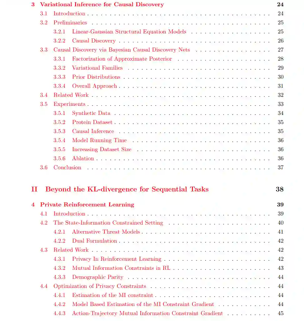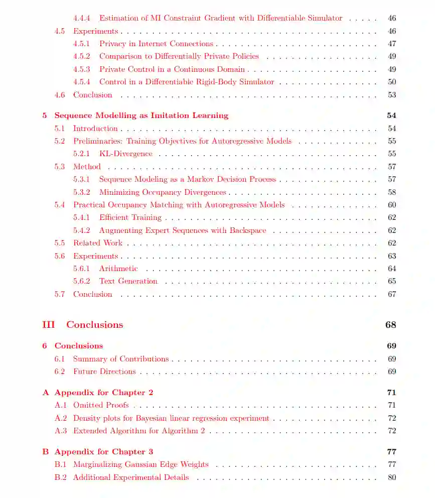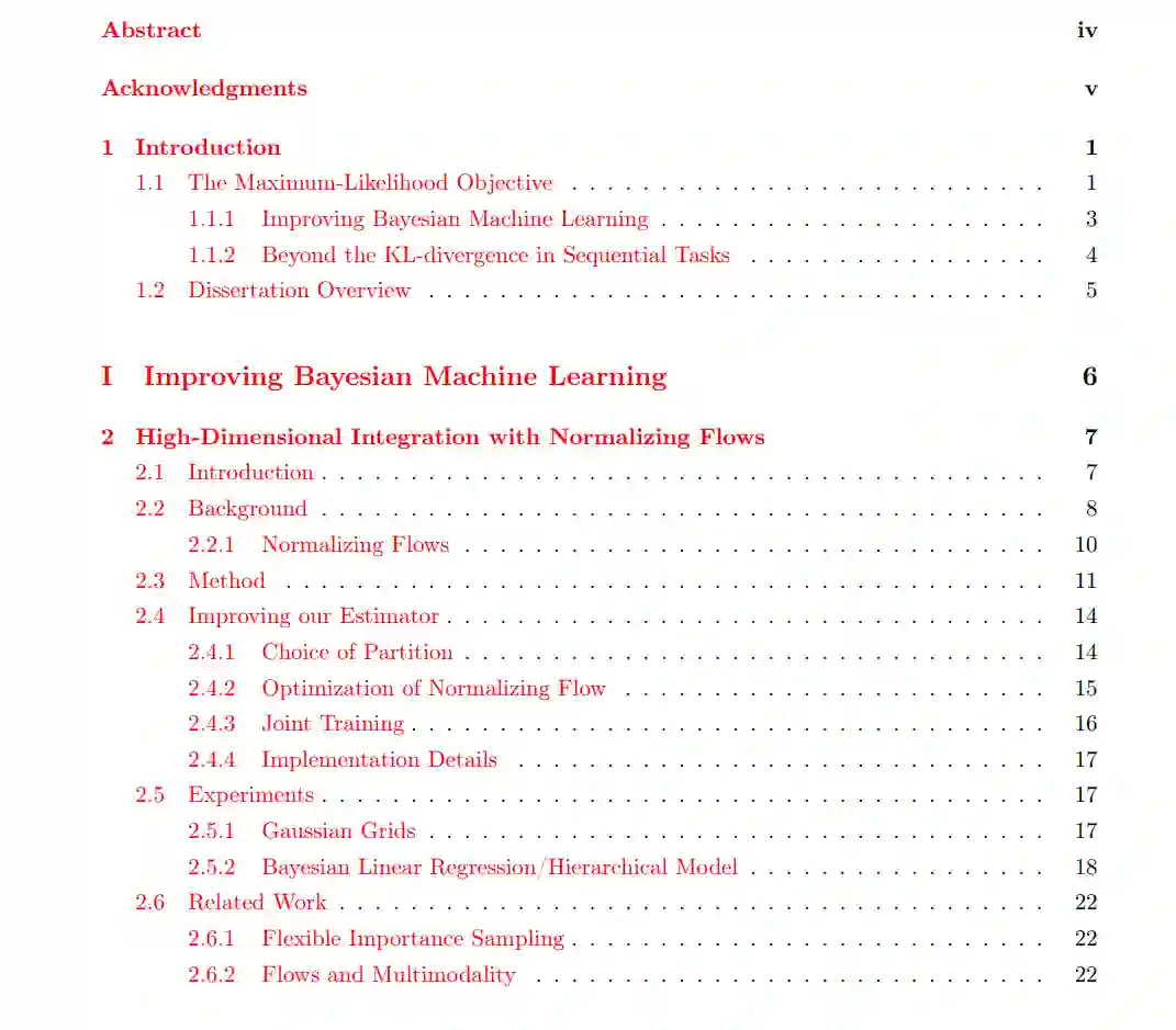最后,最大似然通常与下游任务目标高度一致。例如,在ImageNet发布后变得流行的分类任务中 [DDS+09],最大化正确标签的概率正是训练分类模型的目标。 然而,最大似然目标并不总是最合适的选择。不幸的是,采用非基于似然的目标通常是具有挑战性的。在现代机器学习中,方法的可扩展性和优化的便捷性是所有方法的重要考虑因素。我们面临的挑战是:找到超越最大似然方法的技术,同时保持数据效率、易于通过梯度下降优化,并具备计算扩展性。为了解决这个问题,我们利用了一些在本论文中提出的关键技术:变分推理用于神经函数逼近下的贝叶斯推断,连续松弛和路径梯度估计器用于减少优化中的方差,以及将问题重新参数化为更易处理的等价形式。 本论文分为两部分,但有一个共同的目标:开发超越典型MLE方法的技术。在第一部分中,我们研究了贝叶斯机器学习的改进,尤其在数据较少的情况下,由于数据集的有限性,关于θ的值可能存在相当大的不确定性。首先,我们开发了一种使用正则化流计算高维积分的新方法,并将其应用于计算贝叶斯定理中的归一化函数。然后,我们将变分推理应用于因果发现问题,解决了在复杂有向无环因果图集中构建后验分布的挑战。 在第二部分中,我们研究了在序列任务中超越最大似然的替代训练方法。首先,我们研究了在强化学习中执行隐私约束的问题。这需要控制策略生成的轨迹分布,以确保它们不会泄露有关私有状态变量的信息。最后,我们解决了基于序列数据的自回归模型训练问题。我们将任务重新表述为模仿学习任务,从而可以有效地最小化与数据分布的不同散度。超越MLE方法还为生成过程提供了额外的灵活性,我们通过允许回溯来增强生成过程。