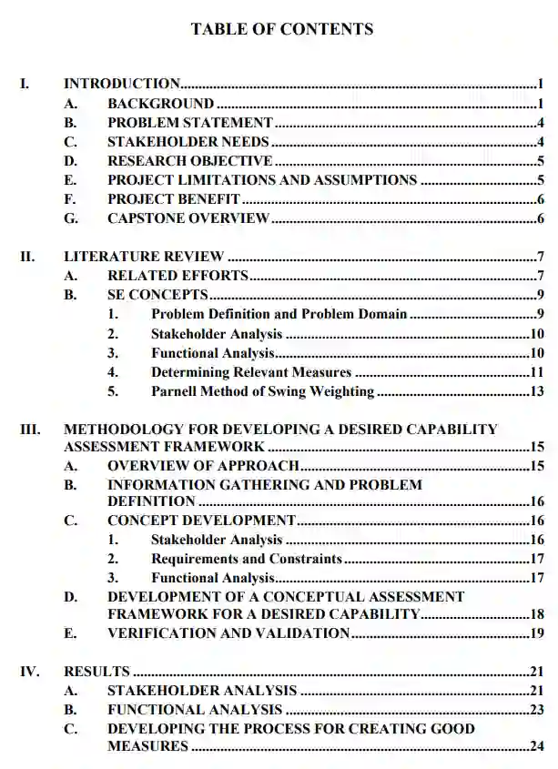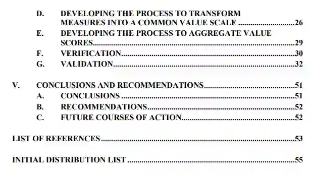 总之,该团队使用系统工程流程建立了一个概念性评估框架系统,该系统将使TRAC-Monterey有能力评估PC21期间展示的新的创新SoS技术的作战能力。该团队开发了一个利益相关者分析,一个由利益相关者衍生的目标层次,一个功能分解,以及一个创建良好措施的过程,将这些措施转化为价值分数,量化措施的重要性,并将产生的价值汇总为一个单一的、行动有效性分数。该框架将为利益相关者提供信息,使他们能够就进一步的技术开发做出明智的决定。TRAC-Monterey还可以将本研究中制定的衡量标准作为指南,在整个PC21和未来的PC活动中收集相关信息。