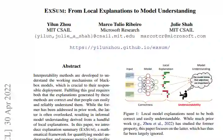开发可解释性方法以了解黑盒模型的工作机制,这对其负责任的部署至关重要。实现这一目标既需要这些方法产生的解释是正确的,又需要人们可以轻松可靠地理解它们。虽然前者已在之前的工作中得到解决,但后者经常被忽视,导致从少数当地解释得出的非正式模型理解。在本文中,我们介绍了解释摘要(EXSUM),一个用于量化模型理解的数学框架,并提出了用于其质量评估的指标。在两个领域,EXSUM 突出了当前实践中的各种限制,帮助开发准确的模型理解,并揭示模型容易被忽视的属性。我们还将可理解性与解释的其他属性联系起来,例如人类对齐、鲁棒性以及反事实的最小化和合理性