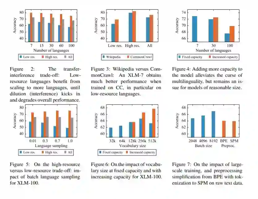 本文表明,在大规模的多语言预训练模型,可以显著地提高跨语言迁移任务的性能。我们使用超过2TB的过滤CommonCrawl数据,在100种语言上训练一个基于Transformer的掩码语言模型。我们的模型被称为XLM-R,在多种跨语言基准测试中显著优于多语言BERT (mBERT),包括XNLI的平均正确率+13.8%,MLQA的平均F1分数+12.3%,NER的平均F1分数+2.1%。XLM- r在低资源语言上表现特别好,与以前的XLM模型相比,XNLI在斯瓦希里语上的准确率提高了11.8%,在乌尔都语上的准确率提高了9.2%。我们还对实现这些收益所需的关键因素进行了详细的实证评估,包括(1)积极迁移和能力稀释之间的权衡,以及(2)大规模高资源语言和低资源语言的性能。最后,我们首次展示了在不牺牲每种语言性能的情况下进行多语言建模的可能性;XLM-Ris在GLUE和XNLI基准上有很强的单语言模型,非常有竞争力。我们将使XLM-R代码、数据和模型公开可用。