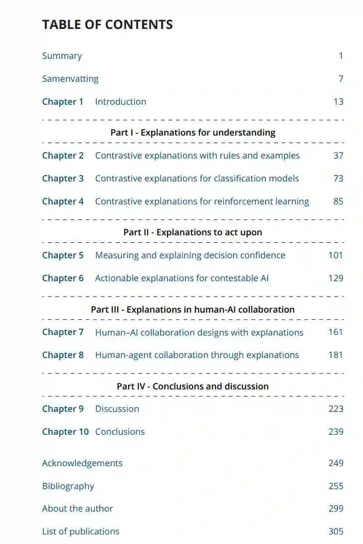 第一部分讨论了人工智能代理如何解释自己做出决定的原因。第二部分讨论了哪些解释有助于人类确定如何根据人工智能代理的决定采取行动。第三部分讨论了在人类与人工智能合作执行道德敏感任务时,解释的设计、功能和效果。最后,第四部分讨论了本研究的发现、局限性和社会影响。本部分还提供了结束语和未来工作,并对 XAI 领域的发展方向提出了建议。