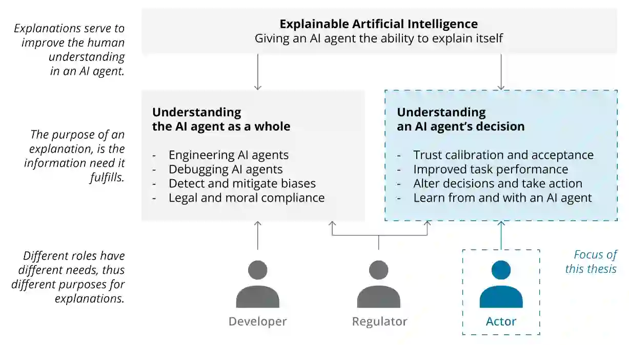 通过解决这个问题,本论文旨在为人工智能代理的负责任应用做出贡献,深入探讨人工智能代理应该解释什么、这些解释能达到什么效果,以及它们如何生成这样的解释。有了这些见解,我们就能设计和开发具有与预期现实应用相匹配的目的的可解释人工智能代理。