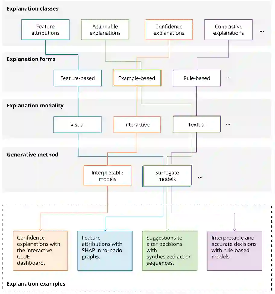 只有将解释的类别、形式和方式与生成解释的方法结合起来,才能形成真正的解释。一种方法只能为特定类别的解释提取信息,形式决定了信息的形状,而方式则决定了信息的传播方式。图 1.2 举例说明了四种此类组合:用于交互式解释人工智能代理信心的仪表板 CLUE [54]、龙卷风图中可视化的特征归因方法 SHAP [55]、通过合成动作序列改变人工智能代理决定的动作建议 [56] 以及通过基于规则的模型解释作出决定的原因 [57]。