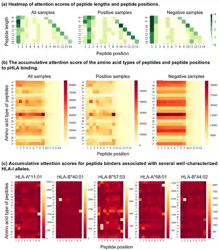 图5.(a)与所有正确预测的样本、正确预测的正样本和正确预测的负样本相关联的注意力分数 (b)肽的氨基酸类型和肽位置对pHLA结合的贡献 (c)与5个充分表征的HLA等位基因相关的肽结合剂的累积注意力分数。注意,较亮的残基被认为在pHLA结合中更重要。