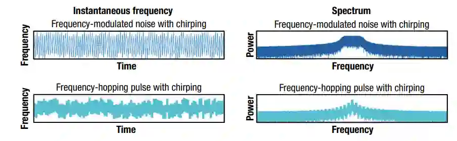 图4. 收到的数据。未经处理的、经过时间转换的I/Q数据,由两种不同的技术组成,具有各种重叠的波形参数和调制。图中用彩色编码来区分频率调制噪声技术(蓝色)和跳频脉冲技术(青色)。